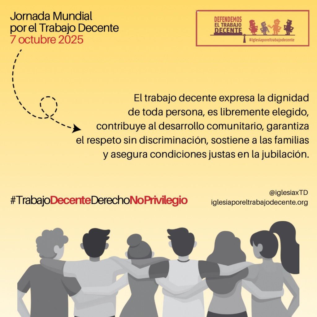 Amb motiu de la Jornada Mundial pel Treball Decent, que es celebra aquest 7 d’octubre, les organitzacions que integren la iniciativa Església pel Treball Decent (ITD) se sumen, un any més, a milions de treballadors i treballadores de tot el món per recordar que la feina decent és un dret irrenunciable, mai un privilegi.